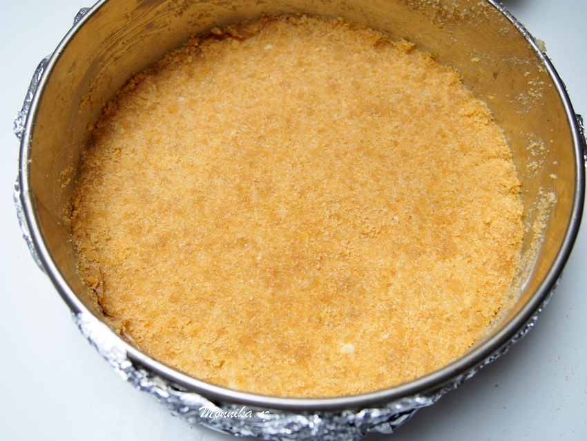 KORPUS: V mixéru jsem rozmixovala máslové sušenky a ty jsem následně smíchala s rozpuštěným máslem. Vzniklou směs jsem dala do vymazané formy (vespod jsem měla ještě pečící papír) a pořádně jsem ji všude zamačkala na dno. Následně jsem dala spodek koláče upéct na 15 minut a 180 stupňů.