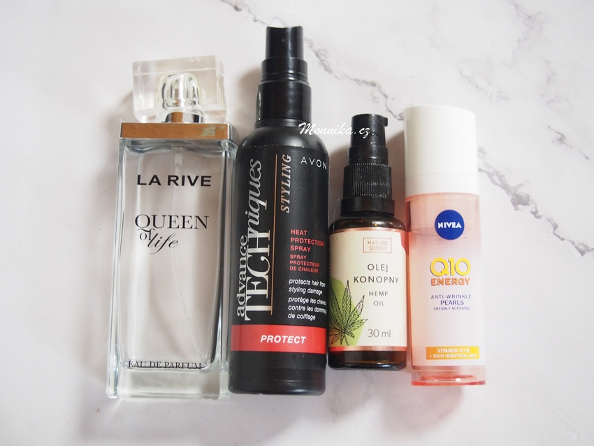 Konečně se mi taky podařilo spotřebovat nějakou vůni. Konkrétně La Rive Queen Life EDP. Tu jsem našla v DM boxu a byla jsem vážně překvapená tím, jak mi vůně sedla. I příteli se moc líbila. Obsahuje tóny rybízu, hrušky, kosatce, pomerančového květu, jasmínu, mandlí, tonky, pralinky, pačuli a vanilky. Je hodně sladká a dost výrazná. Voněla jsem se s ní pravidelně a moc ráda. Sprej na ochranu vlasů před teplem od Avonu jsem si pořídila, abych ho používala při žehlení vlasů. Hádáte správně. Nepoužívala jsem ho. Vždy jsem na to zapomněla a ani mě to nebavilo. Sprej jsem ale vyndala a řekla si, že ho musím konečně spotřebovat. Když už jsem si ho koupila. A tak jsem ho poslední měsíce pravidelně používala. Příjemně voní, má dobrý rozprašovač a vlasy nezatěžuje. Zda chrání opravdu před teplem, to nevím. Ale věřím, že ano. Konopný olej jsem si koupila před delší dobou na vysušená a zarudlá místa na pokožce. Ale zatoulal se mi dozadu do skříně a já ho přehlížela tak dlouho, až prošel. Nicméně jsem ho spotřebovala i prošlý a používali jsme ho na masáže. Má výraznou vůni konopí, takže pokud vám to vadí, nebude to nic pro vás. Má však šikovné malé balení s dávkovačem a dobrou hydratační a zklidňující schopnost. Perličkové sérum Nivea Q10 energy jsem dostala od mamky, protože ji nevyhovovalo. Já jsem měla takový produkt poprvé. Bylo zajímavé sérum vytlačovat. Na ruce jsem vždy měla takovou "divnou hmotu" - tedy rozmačkané perličky. Chvíli trvá, než se produkt na pleti rozetře a všechny "kousky" se ztratí. Ale ne nijak extra dlouho. Sérum je na pleti příjemné. Neštípe, nedráždí, jemně voní a zanechá pleť krásně svěží a projasněnou. Ta aplikace perlového produktu je vážně zvláštní, ale nemůžu říct, že by mě nějak otravovala. Ráda jsem to vyzkoušela.